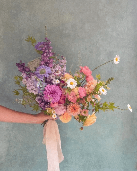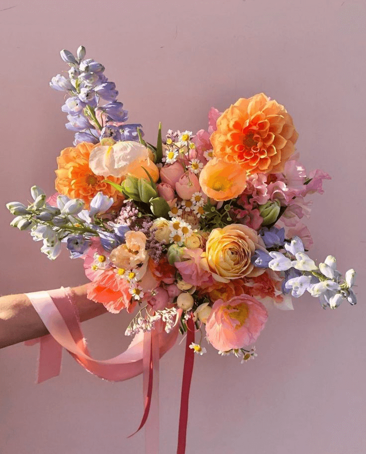 Celebrate the arrival of spring with a bold and colorful bouquet that feels like a floral masterpiece. This arrangement fuses vibrant purples, fiery pinks, deep oranges, and softer peony and anemone tones. Tied with elegant blue ribbons, this statement spring bouquet adds modern energy to a traditional ensemble. Whether for the bride or bridesmaids, it’s ideal for weddings that crave colorful bouquet ideas that won’t go unnoticed.