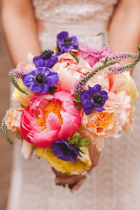 For the bride who wants her bouquet to pop, this vibrant composition of blue anemones, coral peonies, and yellow ranunculus delivers. The striking color contrast makes it perfect for modern spring weddings, and the lush greenery adds grounding balance. Whether in photos or displayed as bold rustic centerpieces, this design is built to stand out.
