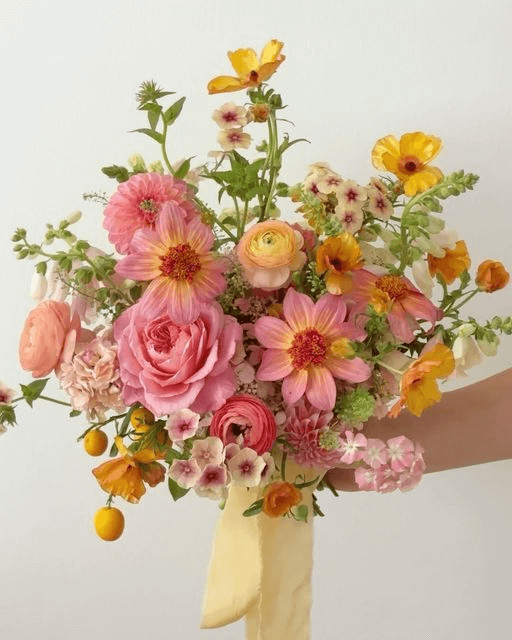 This bouquet captures the softness of spring mornings with pink dahlias, orange roses, and golden buttercups. The result is warm, inviting, and harmoniously balanced. Whether carried down the aisle or arranged on reception tables, it adds elegant warmth to any spring wedding floral palette.