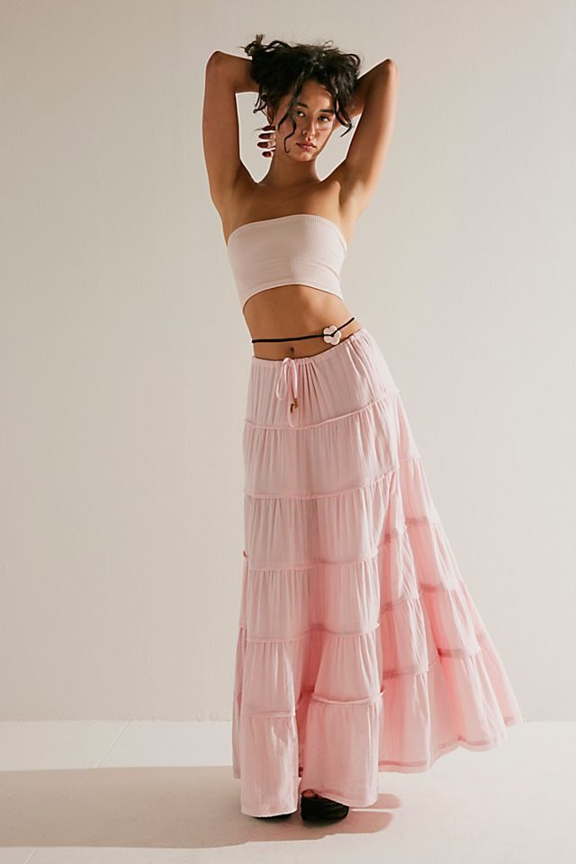 Soft pink layers bring out your romantic side with this flowing tiered maxi skirt. Its sheer texture and gentle volume create a whimsical silhouette that’s both sweet and bohemian. Paired with a simple bandeau or tube top, this outfit becomes the ideal canvas for gold jewelry, floral hair accessories, and delicate sandals. A must-have for beach weddings, music festivals, or dreamy date nights.