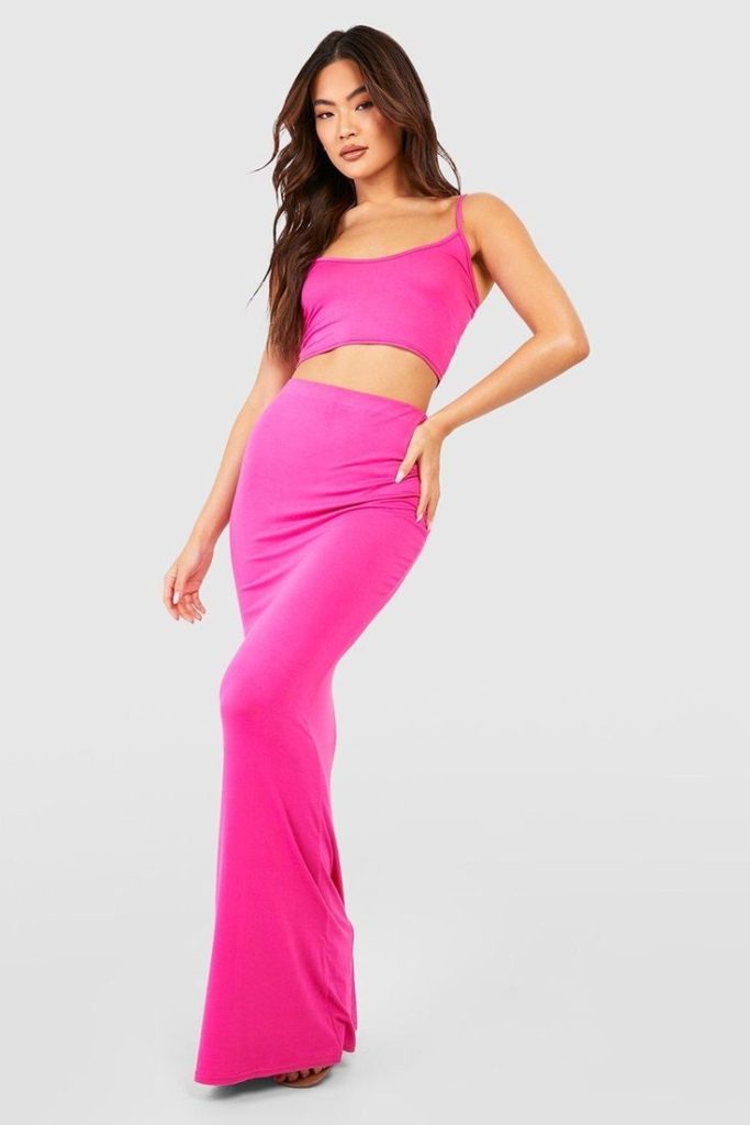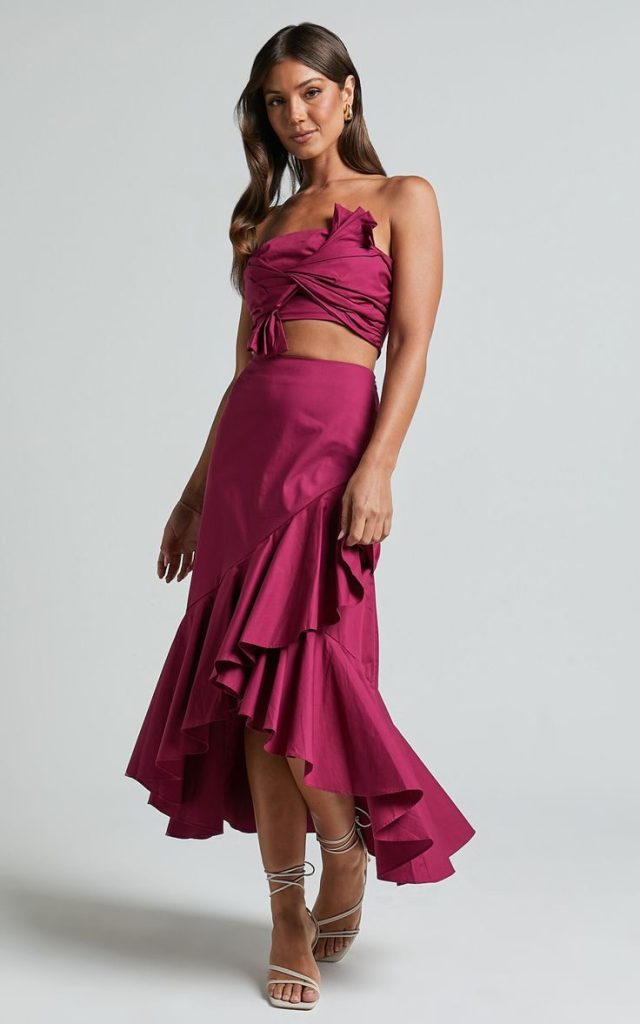 Add a pop of playfulness to your summer wardrobe with a high-low pink wrap skirt. Its cascading hem and matching crop top inject youthful energy into your summer looks. This outfit pairs just as well with heeled sandals for an evening out as it does with flats for daytime exploring. The bold color, flirty cut, and confident vibe make it a standout in any summer style lineup.