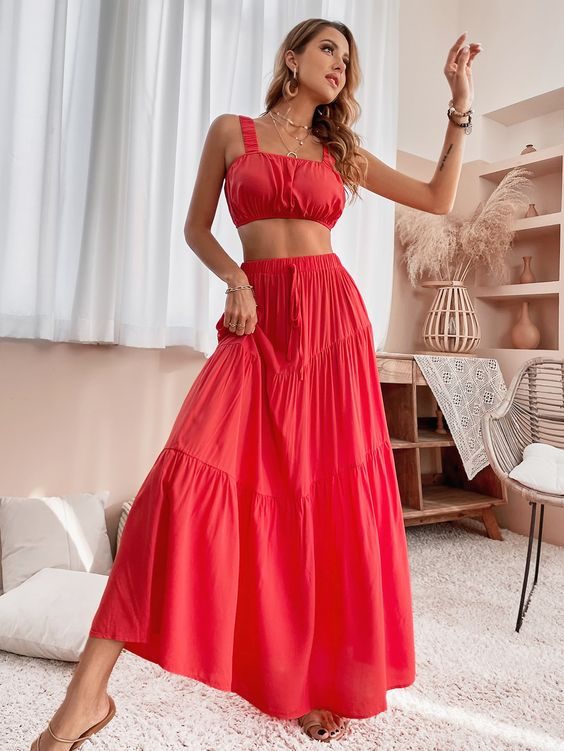 Channel the glow of a summer sunset with a vibrant orange-red pleated skirt that dances with every step. This statement piece adds bold energy to your wardrobe, while the coordinated crop top creates a cohesive two-piece outfit perfect for warm evenings. With its flowing movement and eye-catching color, this look brings a burst of vitality and sophistication to marina strolls, rooftop dinners, or sunset photoshoots. It’s not just stylish—it’s unforgettable.