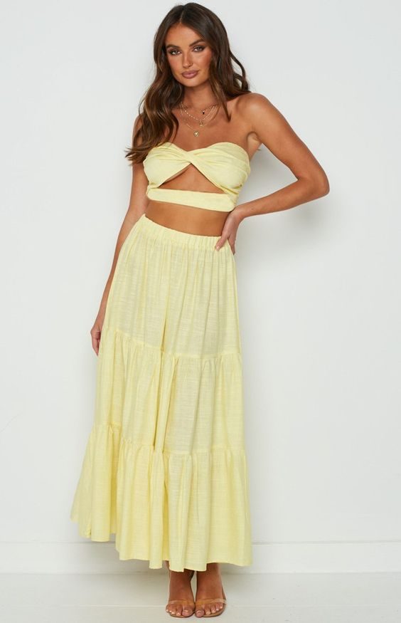 Glow like the summer sun in a yellow tiered skirt that captures the season’s lighthearted essence. The breezy layers of this skirt flow effortlessly, creating a whimsical yet refined look. Styled with a twisted bandeau crop top, the result is a fashionable ensemble that feels fresh, feminine, and fun. Complete the outfit with tan sandals, a straw bag, and sun-kissed skin, and you’re ready for a day in the city or a breezy beach walk.