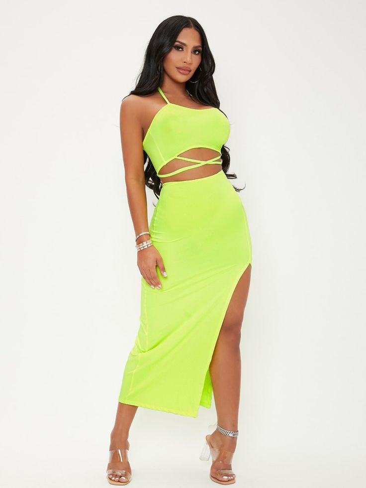 Make a splash this season with a lime green skirt that radiates bold style and energy. Cut-out accents and a fitted silhouette bring a trendy edge, while the one-shoulder crop top balances the look with modern symmetry. Whether for day events or evening parties, this vibrant outfit keeps you looking cool while turning up the heat.