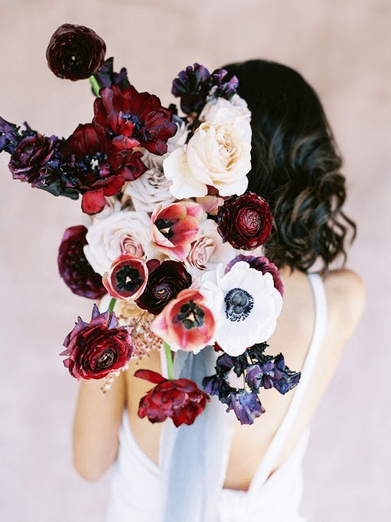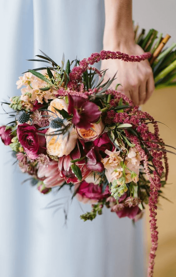 Combining texture and color, this bouquet is a celebration of diversity in floral design. Burgundy tones meet apricot blush blooms, wild berries, and unruly greens in a boho-rustic bouquet that feels freshly plucked from a spring meadow. For the bride who loves unpredictable beauty and natural contrast, this 2025 bouquet offers endless inspiration and a wild elegance fit for the free-spirited.