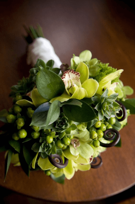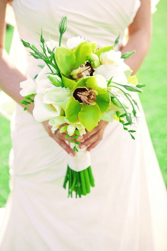Green cymbidium orchids take the spotlight in this contemporary bouquet, paired with crisp white blossoms for contrast and brightness. The modern lines and bold hues reflect a bride’s individuality and strength, ideal for a chic city wedding or minimalist spring celebration. As part of the 2025 spring wedding flowers bouquet trend, this look pairs elegance with personality—ideal for daring, fashion-forward brides.
