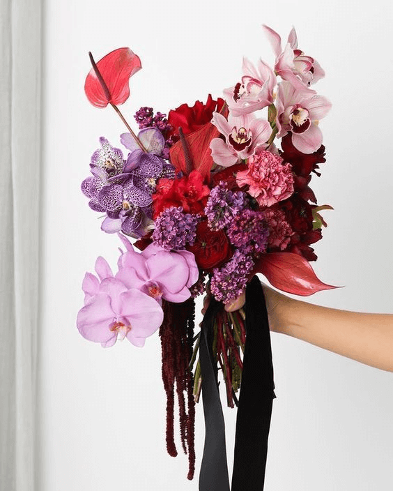A rich fusion of red and pink peonies, orchids, and roses makes this bouquet a modern classic. It evokes a passionate tone with its bright colors while maintaining soft elegance. This is the go-to arrangement for brides who want spring wedding flowers that express their love boldly but tastefully—a romantic nod to timeless glamour reimagined for 2025.