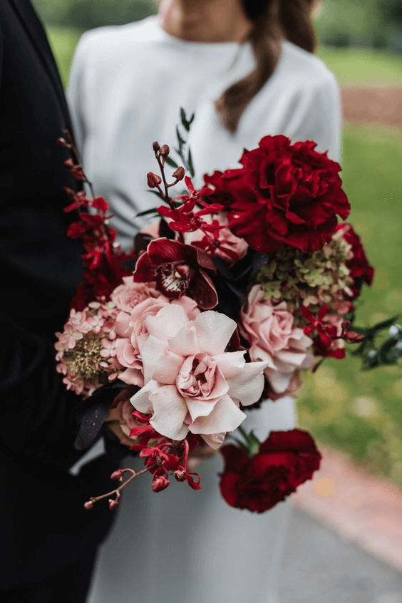 This bouquet is a stunning mix of crimson peonies, rich red roses, and soft blush blooms, creating a color story full of romance and drama. The saturated hues evoke deep love and emotional richness, making it perfect for bold brides. Paired with pastel bridesmaid dresses or contrasted against a minimalist wedding palette, this 2025 bouquet elevates spring wedding flower color schemes to passionate new heights.