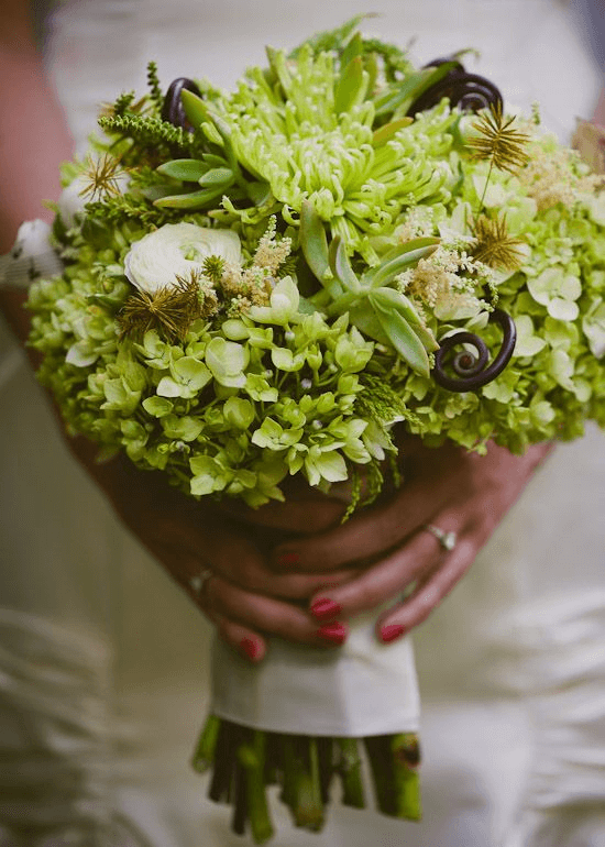 Imagine holding a bouquet that radiates the energy of a blossoming spring morning—this vibrant green arrangement does just that. With vivid shades of green, swirling fiddlehead ferns, and budding blooms echoing the freshness of peonies, this bouquet stands out in both color and texture. Succulents add a rustic twist, making this the perfect statement piece for brides who seek wild beauty and nontraditional flair in their 2025 spring wedding flowers bouquet.