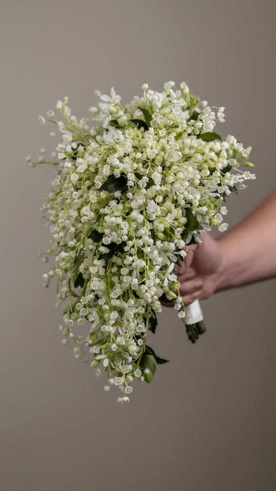 This bouquet captures movement and romance with cascading flowers that seem to flow effortlessly from the bride’s hands. It adds a dramatic silhouette to the soft charm of lily of the valley, ideal for cathedral weddings or elegant evening ceremonies in 2025.