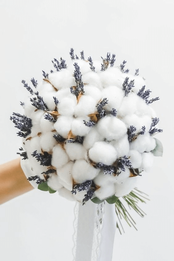 Soft lavender sprigs paired with white cotton create a romantic bouquet perfect for brides who seek calm, soothing color schemes. The pastel tones and rustic vibe make this bouquet a charming addition to a countryside ceremony or a minimalist bridal style in 2025.