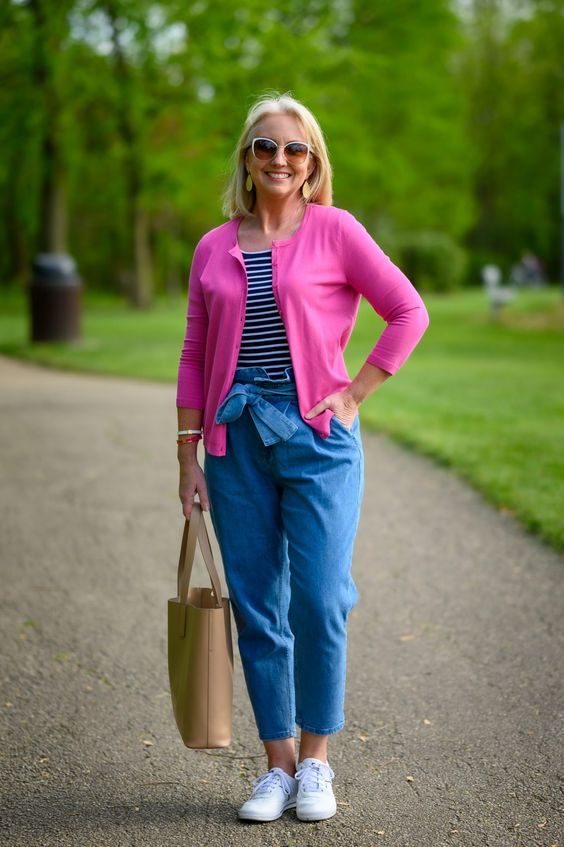 A pink cardigan layered over a striped shirt, paired with jeans, brings a relaxed energy to summer dressing. White sneakers complete the ensemble, making it perfect for everyday errands, weekend outings, or morning walks in the park.