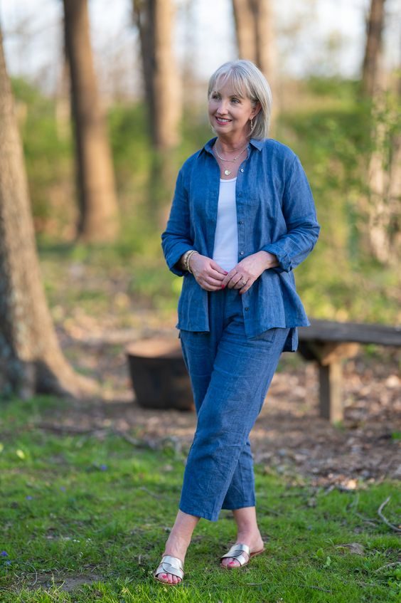 Layering in summer becomes breezy with a chambray overshirt worn open over a white blouse and linen pants. Metallic sandals offer shine, while the overall look remains calm and practical. This ensemble works well in professional or casual environments, making it a stylish staple for any age.