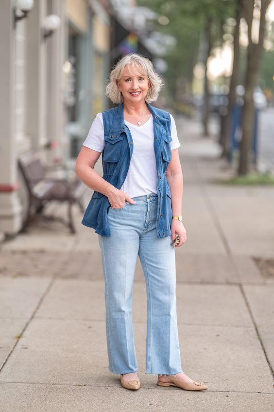 This casual yet polished outfit blends denim elements for a timeless summer staple. A sleeveless denim vest layered over a white tee, paired with light-wash jeans, creates a cohesive and flattering look. Accessorized simply, it transitions easily from day outings to casual dinners, fitting beautifully into a mature wardrobe.