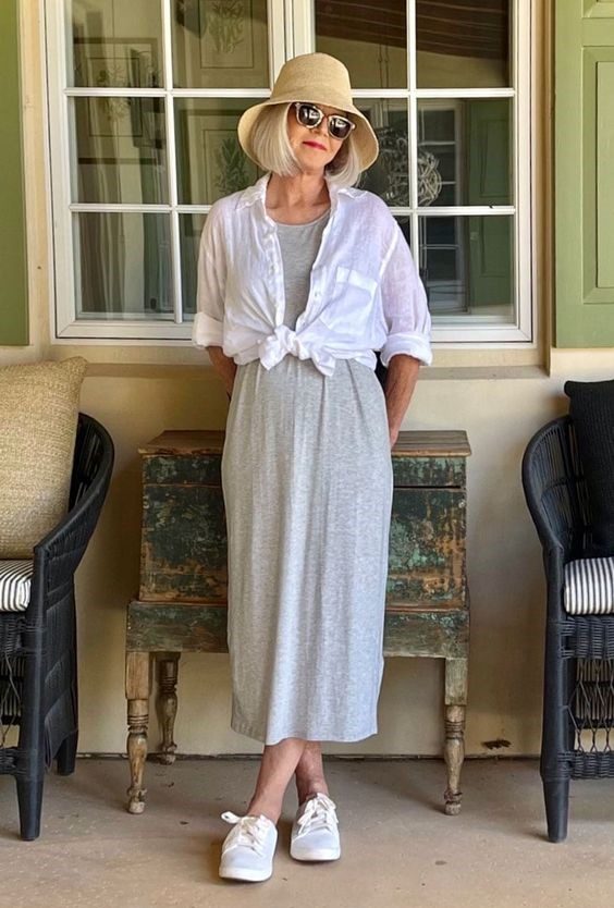 Monochrome doesn’t mean monotonous—it means refined ease. A midi grey dress layered with a knotted white linen shirt creates an airy silhouette that’s flattering and stylish. Paired with minimalist white sneakers and a straw hat, this outfit captures modern street style for the 50+ woman exploring a vibrant summer in the city or spending a day at Disney with loved ones.