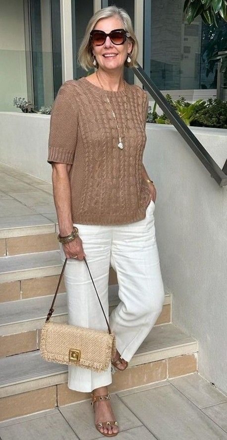 Natural tones and breathable fabrics come together to create an outfit rooted in refined taste. A textured brown sweater meets white linen trousers in a perfect contrast of structure and flow. Finished with a long pendant necklace and a straw bag, this look speaks to relaxed vacation vibes and timeless elegance. Whether you’re in your 30s or enjoying style in your 60s, this outfit exudes sophistication across generations.