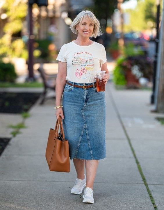 Youthful and energetic, this combination features a graphic tee tucked into a denim midi skirt. Paired with sneakers and a leather tote, it’s a fun and laid-back outfit ideal for brunch, market visits, or birthday gatherings. It’s casual street style made age-appropriate and trendy.