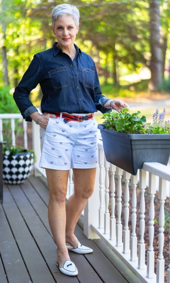 Inspired by the timeless nautical trend, this outfit delivers charm and comfort. A denim shirt with rolled sleeves pairs effortlessly with white shorts adorned with small anchor prints. The pop of a red belt injects vibrancy, evoking the free-spirited essence of coastal travel. Whether you’re lakeside camping or gardening, this look combines functionality with fun—ideal for those who love a blend of classic summer style and practicality.