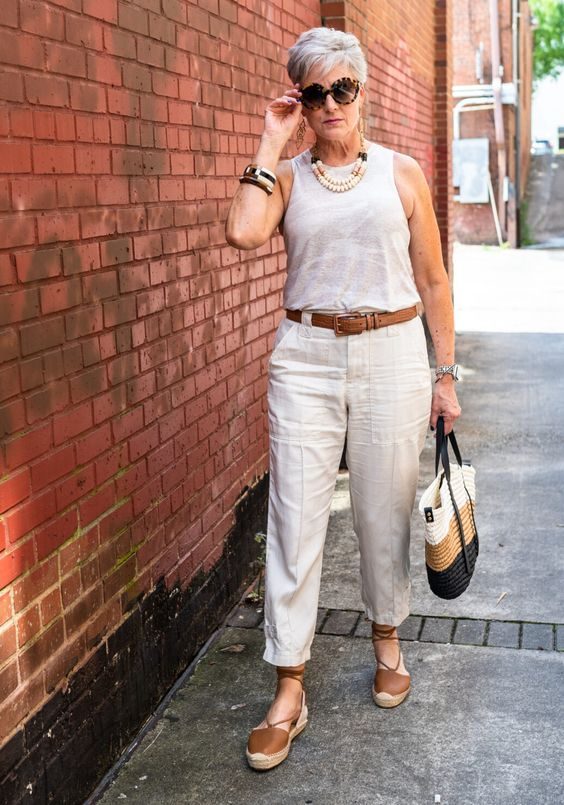 This understated ensemble uses soft tones to deliver maximum sophistication. A sleeveless top paired with cream pants and a brown belt forms a cohesive, polished silhouette. Espadrilles and a two-tone handbag elevate the look. Whether heading to work or a European vacation, this outfit is a capsule wardrobe staple built on timeless appeal.