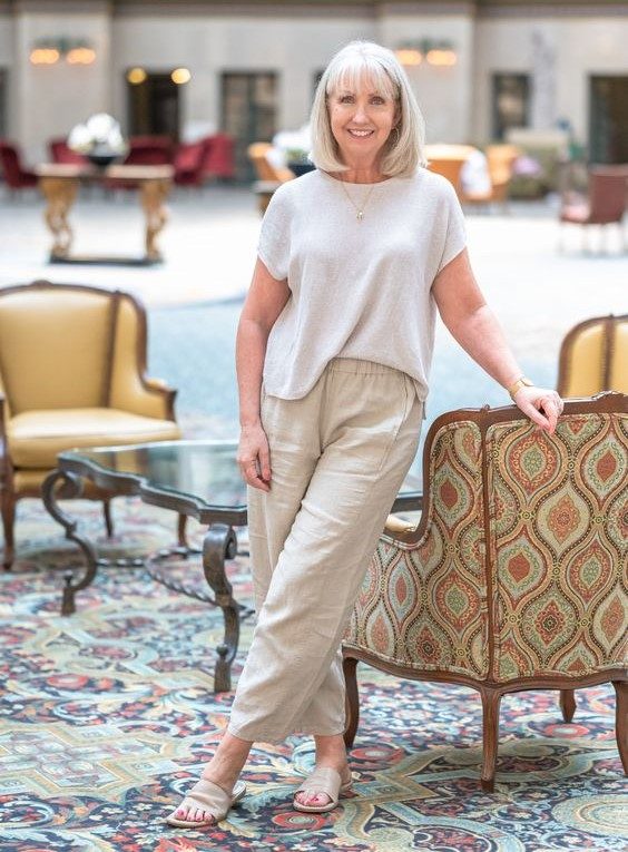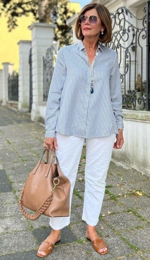 Serene and refreshing, this look features a sleeveless blue top tucked into white linen trousers. Statement accessories like a gold necklace and woven bag tie the outfit together, making it ideal for brunch or a sunset boardwalk walk. The light, breathable textures cater to summer ease and style for women over 50 embracing effortless dressing.
