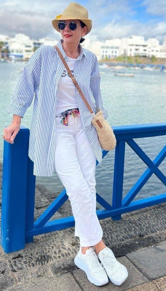 With airy white layers and relaxed tailoring, this outfit is perfect for coastal outings. A tied shirt over wide-leg pants and accessorized with a straw hat and crossbody bag captures nautical ease. White sneakers add a modern edge to a timeless summer silhouette, great for resort stays or harbor strolls.