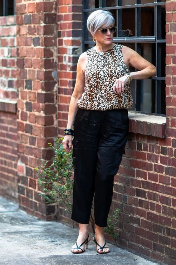 A leopard print tank top combined with black capris creates a bold yet classic ensemble. Black heeled sandals and statement jewelry enhance the outfit, making it an excellent choice for a city stroll or rooftop event. It embodies confidence and flair, ideal for mature women who enjoy exploring their urban jungle in fashion-forward style.
