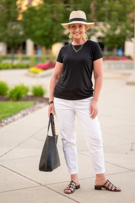 Sophisticated yet youthful, this ensemble plays with contrasts to make a strong visual statement. A black relaxed-fit tee tucked into white capris exudes summer balance. A panama hat adds classic charm, while a silver necklace and studded sandals introduce a hint of edge. It’s a bold interpretation of minimalist elegance, perfect for a confident woman navigating between career and leisure, blending structure with contemporary flair.