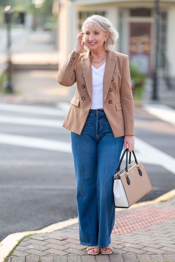 A classic tan blazer over a white tee and blue jeans redefines smart-casual. This outfit is equal parts structure and comfort—professional, yet approachable. Paired with a two-tone handbag and stylish sandals, it’s a chic pick for a casual business lunch or a stylish day at the office.