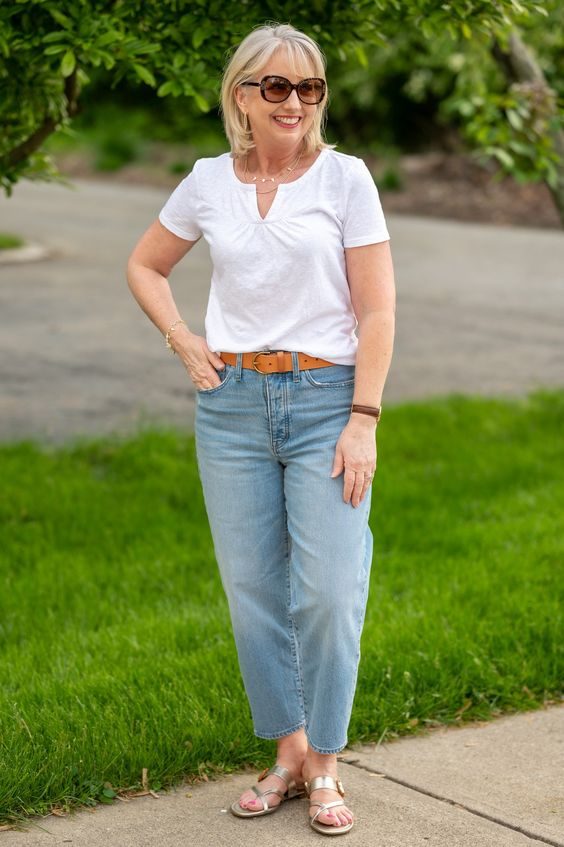 Classic never goes out of fashion. A white tee tucked into straight-leg jeans, accessorized with a tan belt and wristband, creates a relaxed yet elegant outfit. This minimalist combo allows for personalization through colorful shoes or statement earrings—perfect for casual shopping trips or everyday summer activities.