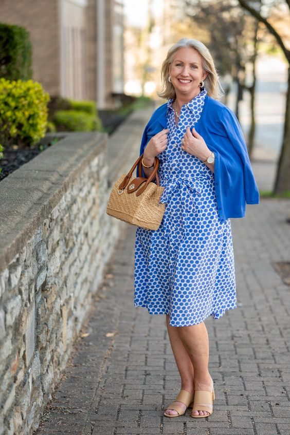 Bold prints meet timeless cuts in this vibrant summer outfit. A patterned blue-and-white dress layered with a cobalt blue jacket makes a stunning statement. Neutral sandals and a woven handbag ground the look, making it ideal for summer birthday celebrations or resort wear. It’s a vivid interpretation of classic elegance infused with contemporary European flair.