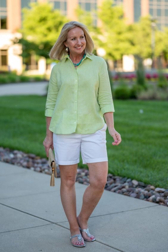 Lime green adds an energizing burst to this warm-weather look. A lime button-up shirt paired with crisp white shorts brings vibrancy and youthfulness, while comfy sandals keep the look grounded. This ensemble is perfect for festive gatherings, vacation adventures, or poolside celebrations.