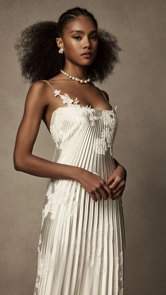 Architectural elegance defines this pleated wedding dress. The crisp structure of the bodice flows into dynamic pleats that sway with every step. Perfect for the fashion-forward bride, this gown offers a balance of clean lines and high-fashion edge—an ideal look in 2025’s bridal couture scene.