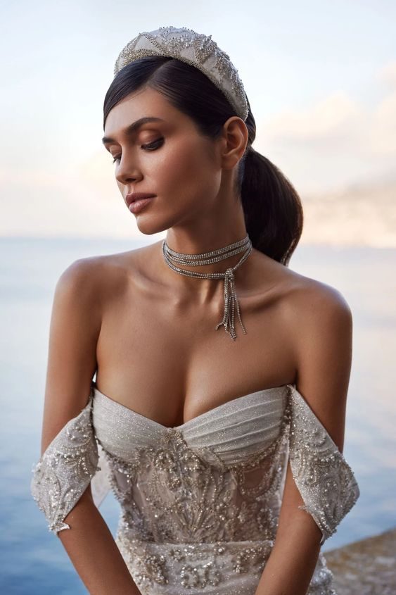 Crafted for queens, this off-shoulder ball gown is encrusted with beadwork that sparkles from every angle. A structured silhouette and elegant choker elevate the drama. For the bride who dreams of royalty and isn’t afraid to shine, this is the definition of extravagant wedding couture for 2025.