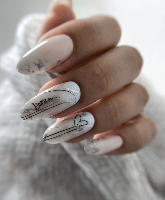 Perfect for the romantics, this delicate design features a pale pink base with minimalistic black script and subtle illustrations like clouds or stars. Words like “Dream” transform your nails into tiny pieces of poetry. This artistic and airy design pairs beautifully with flowing maxi skirts, bohemian tops, and light, dreamy textures for a summer look straight out of a fairytale.