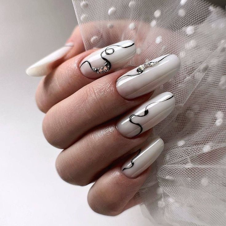 If you view your nails as a canvas, this design is a masterpiece. Fluid black waves flow across a soft white base, accented with crystals that catch the light. The abstract lines and minimalist design make these nails ideal for dreamers, artists, and creatives alike. Wear them with boho styles or minimalist ensembles to let the artwork shine.