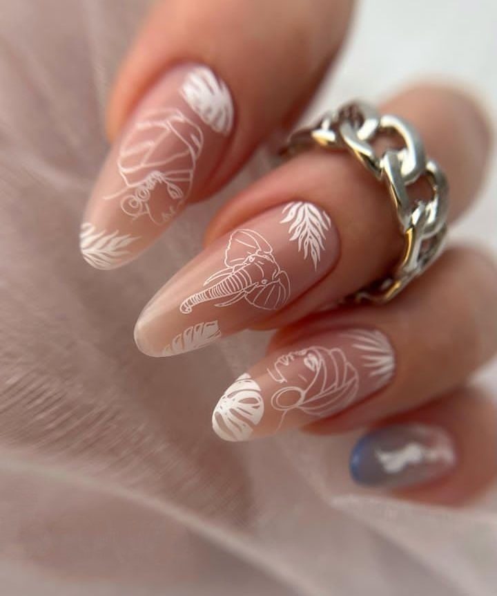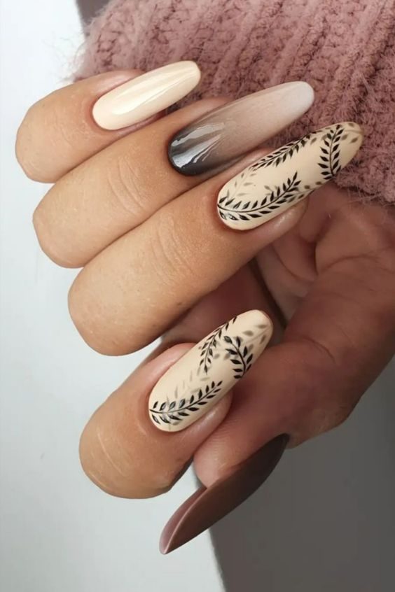 Celebrate earth tones with a touch of boho soul. These oval nails blend beige, taupe, and subtle patterns like leaves and tribal lines, offering a chic and grounded look. Ideal for music festivals, outdoor markets, or casual evenings, this design pairs beautifully with neutral-toned clothing and handcrafted accessories.