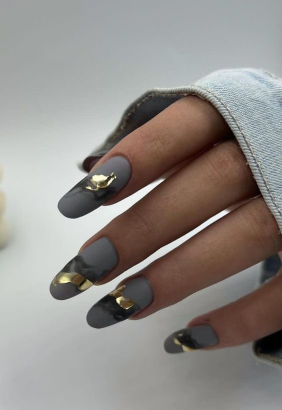 For the bold and confident, deep grey nails embellished with gold foil make a daring statement. The moody, matte tone is elevated with luxe metallic edges, creating a striking balance of edginess and elegance. This design pairs perfectly with night-out looks like a leather jacket and heels or tailored suits for high-powered brunches. It’s the definition of bold feminine energy for Summer 2025.