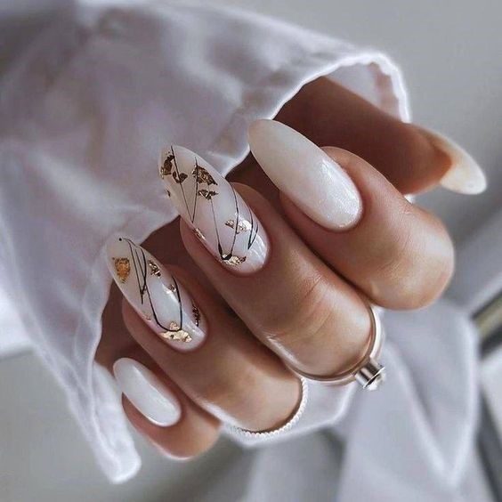 End the season with this sweet and subtle floral nail design. A white base provides the backdrop for soft botanical accents and tiny gold leaves. This look captures the essence of a tranquil summer moment, ideal for vacations, outdoor weddings, or slow weekends in the sun.