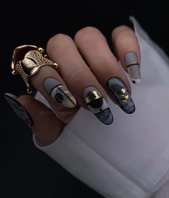 Make an entrance with nails that double as wearable art. Geometric patterns in grayscale, highlighted with gold metallic accents, create a cool, modern design for evening events or stylish city strolls. These nails complement bold outfits like tailored blazers, jumpsuits, or sleek gowns—perfect for the fashion-forward woman.