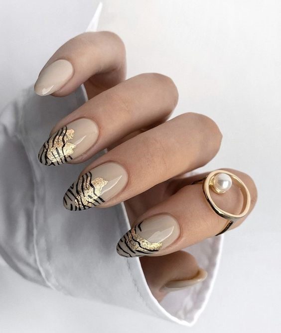Unleash your inner wild side with this fierce reinterpretation of the classic French tip. Long oval nails are painted in neutral tones with dramatic black tips and golden streaks resembling tiger stripes. Perfect for adventurous spirits, this bold design pairs stunningly with animal prints or sleek black dresses, making it ideal for fashionistas who love to turn heads.