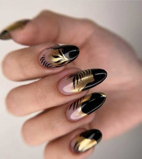 Monochrome marble nails offer timeless sophistication, especially when touched with hints of gold. The swirling black and white design is chic and versatile, while the gold foil adds a refined finish. These oval nails can transition from daytime meetings to nighttime events effortlessly, pairing well with a power suit or adding dimension to a simple black-and-white outfit.