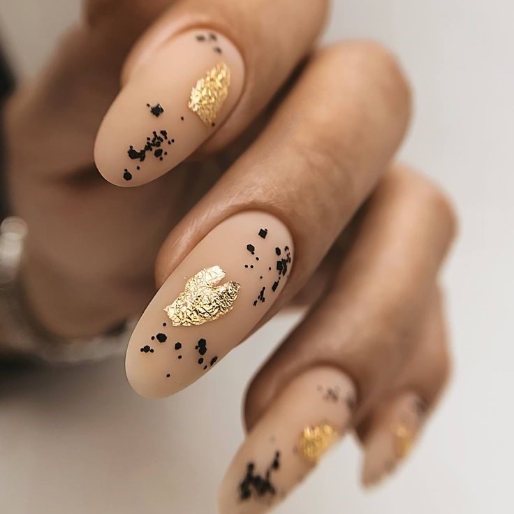 Nude oval nails adorned with gold accents capture the soft glow of summer evenings. A creamy nude base—evoking sun-kissed skin—is speckled with random flakes and leaflets of gold foil, creating a luxe but minimal look. This style speaks volumes with its quiet charm, making it perfect for linen sundresses or relaxed denim ensembles. It offers a subtle sparkle that elevates everyday fashion without overwhelming your natural style.