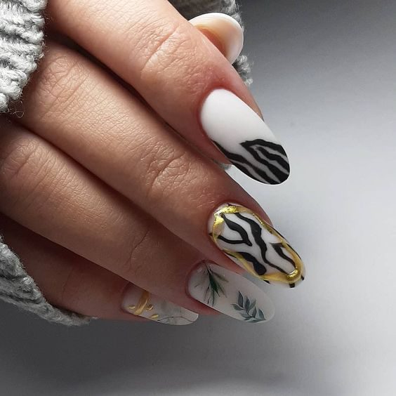 Bring a touch of the wild to your fingertips with zebra stripes accented with gold. The dramatic black and white pattern is both edgy and chic, while the gold foil brings a touch of luxury. Whether paired with statement accessories or minimalist fashion, these nails add boldness and charm to your summer wardrobe.