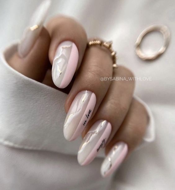 A dreamy blend of soft pink and white marble creates a serene, feminine design perfect for summer. Gold striping subtly outlines the marbled edges, adding a whisper of glam. This nail art speaks to those who favor delicate elegance over loud trends, complementing cozy knits, pastel blouses, and flowing skirts for both casual and semi-formal occasions.