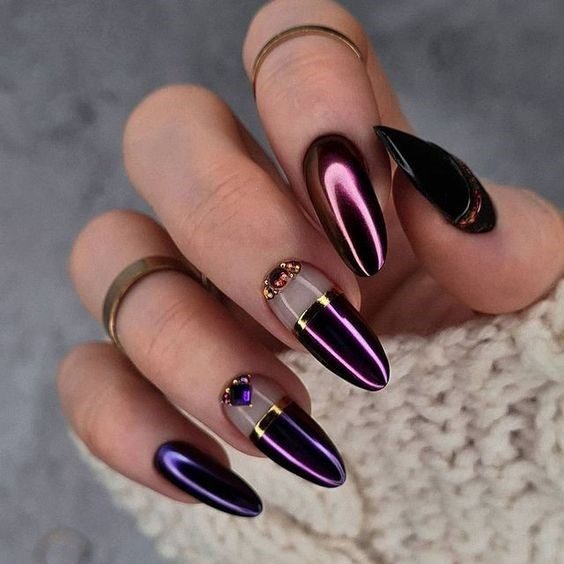 Let your nails dazzle under the lights with this hypnotic metallic look. Hues of purple and black in a chrome finish shimmer with every movement, making them ideal for evening parties or nights on the dance floor. These oval nails speak to those who embrace bold fashion and want their manicure to be the center of attention.