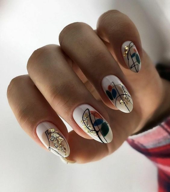 Channel the spirit of contemporary art with this geometric nail design. Oval nails serve as a canvas for angular shapes in black, blue, and red, with metallic gold foil woven into the layout. This design breaks the mold of traditional manicures, bringing museum-worthy flair to your look. Pair these nails with a structured blazer, minimalist jumpsuit, or any outfit that craves a burst of personality and style.