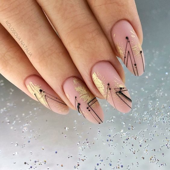 Minimalist meets maximalist in this striking nail design. A nude base is overlaid with bold black stripes and fine gold touches, turning your nails into miniature art pieces. Perfect for gallery openings, rooftop parties, or stylish day-to-night transitions, this design is for the modern woman with a creative edge.