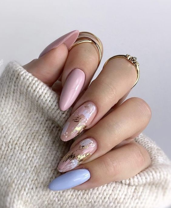 Blend baby pink with soft blue, and you get a sweet, elegant look ideal for summer’s gentle aesthetic. Gold leaf embellishments elevate this simple design to one of effortless luxury. These oval nails work with pastel midi dresses, soft cashmere, or cozy knits for cooler nights. It’s a romantic, day-to-night design that feels fresh and feminine.