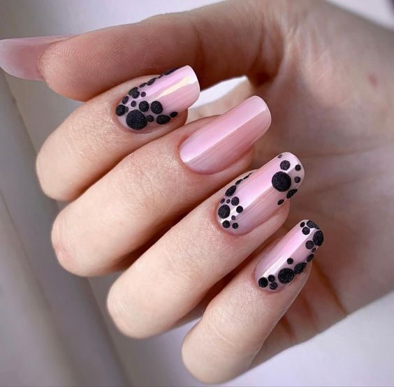For a youthful and cheerful vibe, these nails combine a soft pink base with contrasting black polka dots. The pattern adds a fun twist to a classic color, making it perfect for summer picnics, casual brunches, or playful daytime dates. The short oval shape makes this design practical and trendy, perfect for adding personality to your warm-weather outfits.