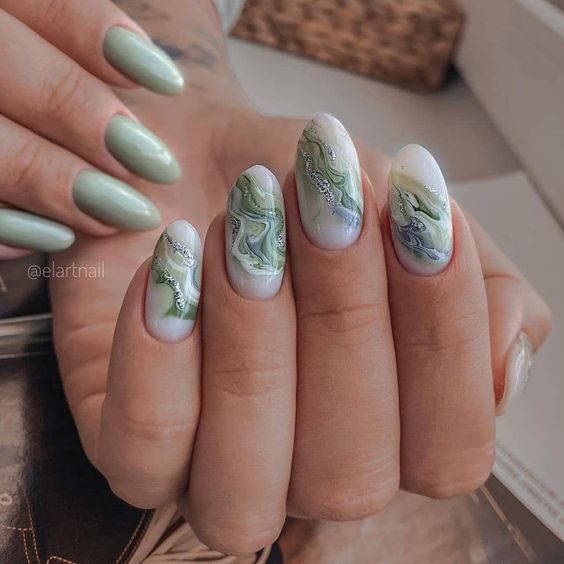 Embrace serenity with this soft seafoam green nail design swirled with hints of white and silver. These oval nails evoke the gentleness of waves and the coolness of a coastal breeze. With a medium length that’s wearable yet artistic, they complement pastel summer dresses, cotton tops, and everything that whispers calm and relaxation.